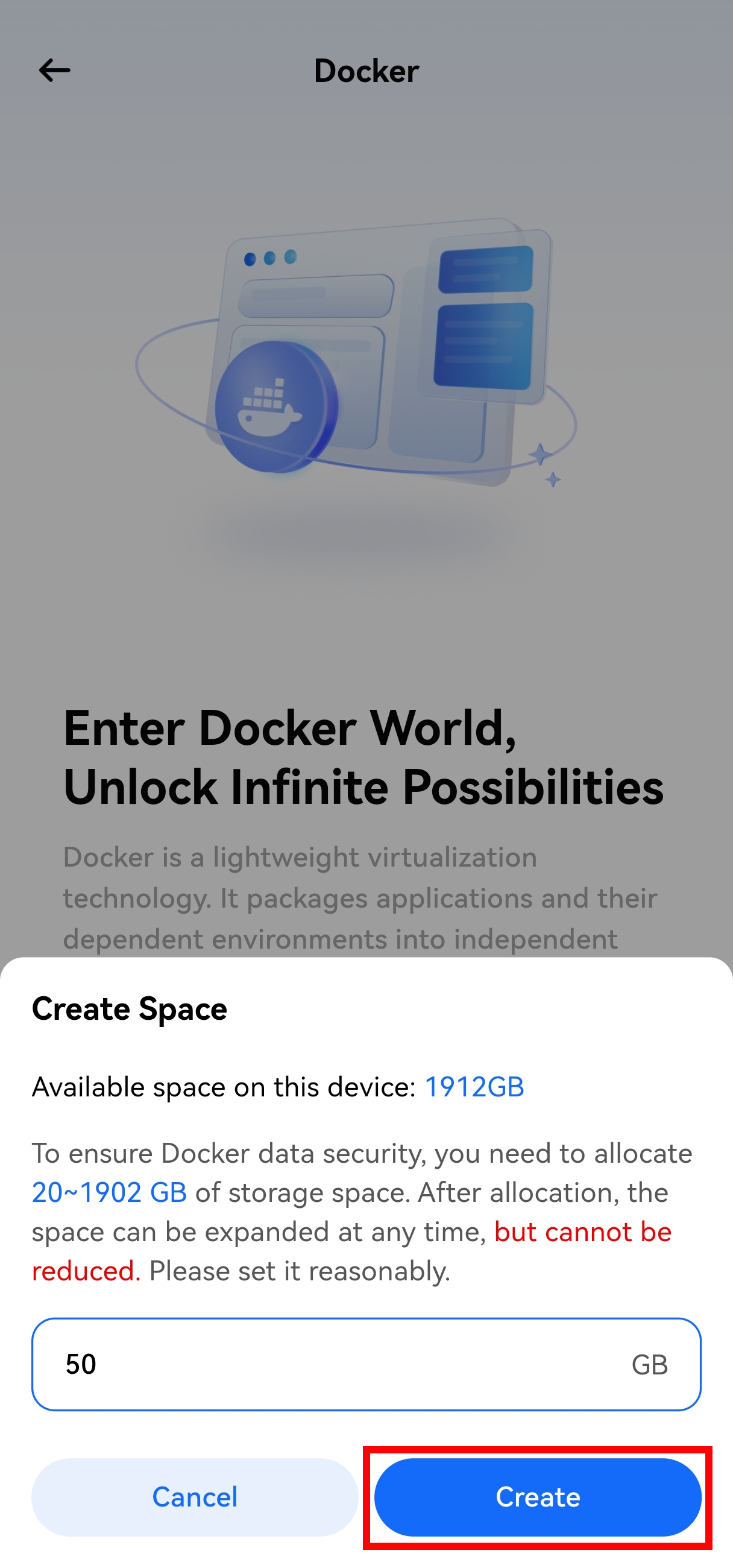 To install a container app for the first time, you need to initialize Docker-related settings and allocate storage space.